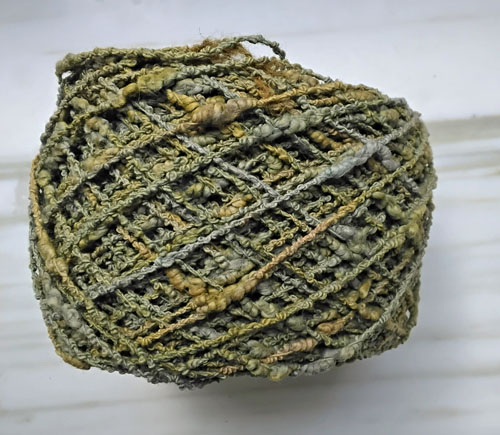 on voit mieux le chamarré d'en haut. Pourquoi cette bouclette particulière? Partie en polyesther? Idem les autres essais de ce cône là. J'essaie donc en synthétique, M. m'a donné de vieux mais vieux sachets de Belgica, la marque de la droguerie Le Lion.
