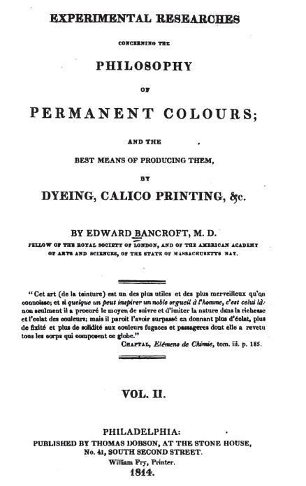 Philosophy of permanent colours and the best means of producing them, by dyeing calioco printing, par Edward Bancroft - vol 2, 1814, via googlebooks.