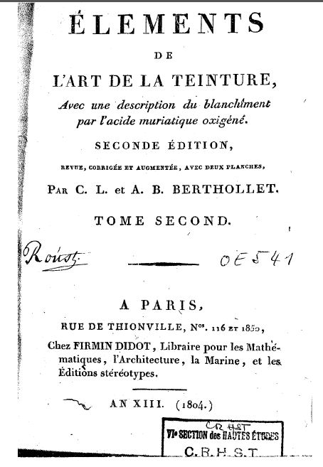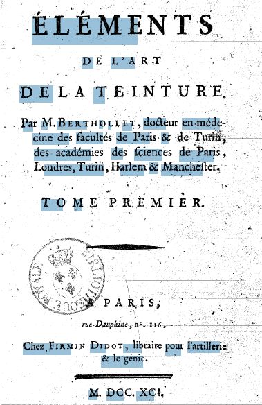 Eléments de l'art de la teinture par M. Berthollet 1791. En deux tomes. Via gallica.bnf.fr (Bibliothèque nationale de France).