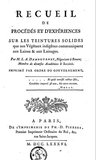Recueil de procédés et d'expériences sur les teintures solides que nos végétaux indigènes communiquent aux laines et aux lainages, par Louis Auguste Dambourney, 1786 - via googleboooks. Deuxième source de mes consultations. Pour le pragmatisme du commerçant?