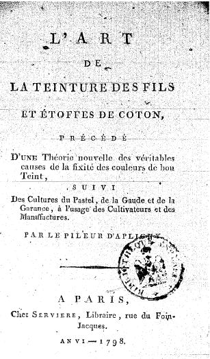 L'art de la teinture des fils et étoffes de coton ; précédé d'une Théorie nouvelle de véritables causes de la fixité des couleurs de bon teint ; suivi Des cultures du pastel, de la gaude et de la garance, à l'usage des cultivateurs et des manufactures par Le Pileur d'Apligny. 1798. Source gallica.bnf.fr / Bibliothèque nationale de France.