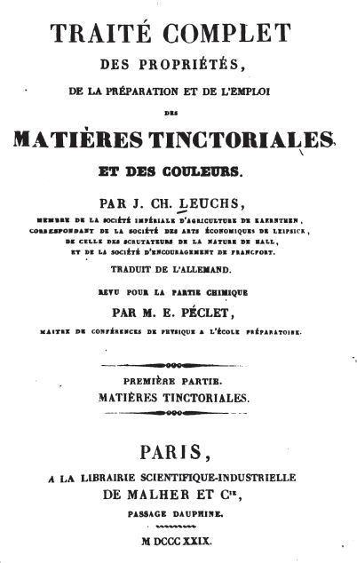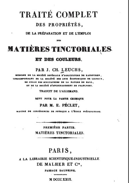 Traité complet des propriétés, de la préparation et de l'emploi des matieres tinctoriales et des couleurs. par J. Ch. Leuchs, en deux volumes (le deuxième traitant de notre sujet), via googlebooks. MDCCCXXIX = 1829. Ma première source de consultation. Peut-être son pragmatisme allemand?