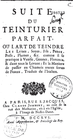 L'art de la teinture des laines et des étoffes de laine en grand et petit teint , avec une instruction sur les débouillis, par M. Hellot. Date "MDCCL" = 1750. Via gallica.bnf.fr (Bibliothèque nationale de France).