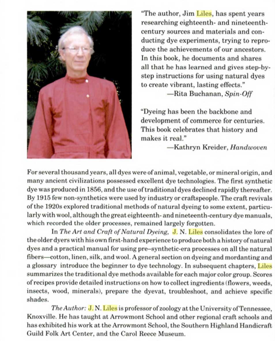 "C'est le manuel le plus complet écrit sur les colorants naturels depuis le début des années 1800. Jim Liles a sauvegardé les compétences anciennes de la quasi-extinction et les a partagées dans un livre qui inspirera, défiera et guidera la teinture moderne. » - Rita Buchanan, auteure de A Weaver's Garden, et rédactrice en chef du nouveau Brooklyn Botanic Gardens Handbook on Natural Dyes"