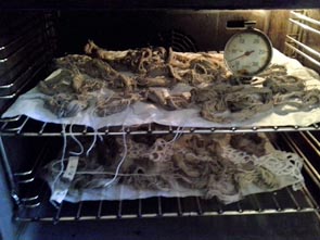 Les tissus supportent bien le séchoir. Les écheveaux sèchent calmement sur des radiateurs, en hiver (long en Belgique...). Avant de me mettre à sécher les écheveaux de coton/lin en bas nylon au séchoir, hors hiver, je séchais parfois les écheveaux en four ménager.