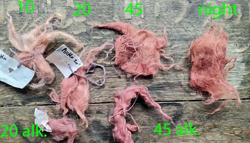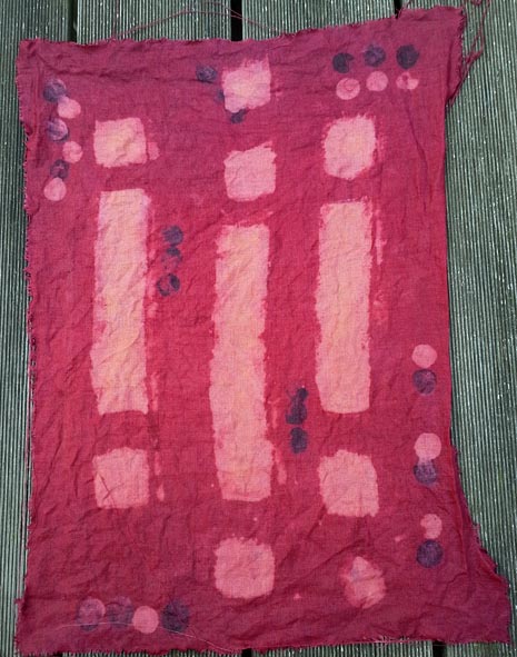 Selon une recette de Jenny Dean. Ici on extrait la couleur pendant quelques jours, dans une solution alcaline; puis on filtre le jus et on teint la fibre au bouillon, en version classique - ce qui permet un bel unisson sur les tissus. En teinture d'écheveaux, on peut procéder autrement, voir fiche suivante.