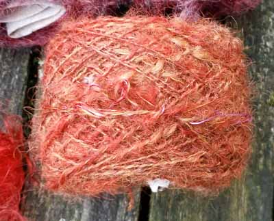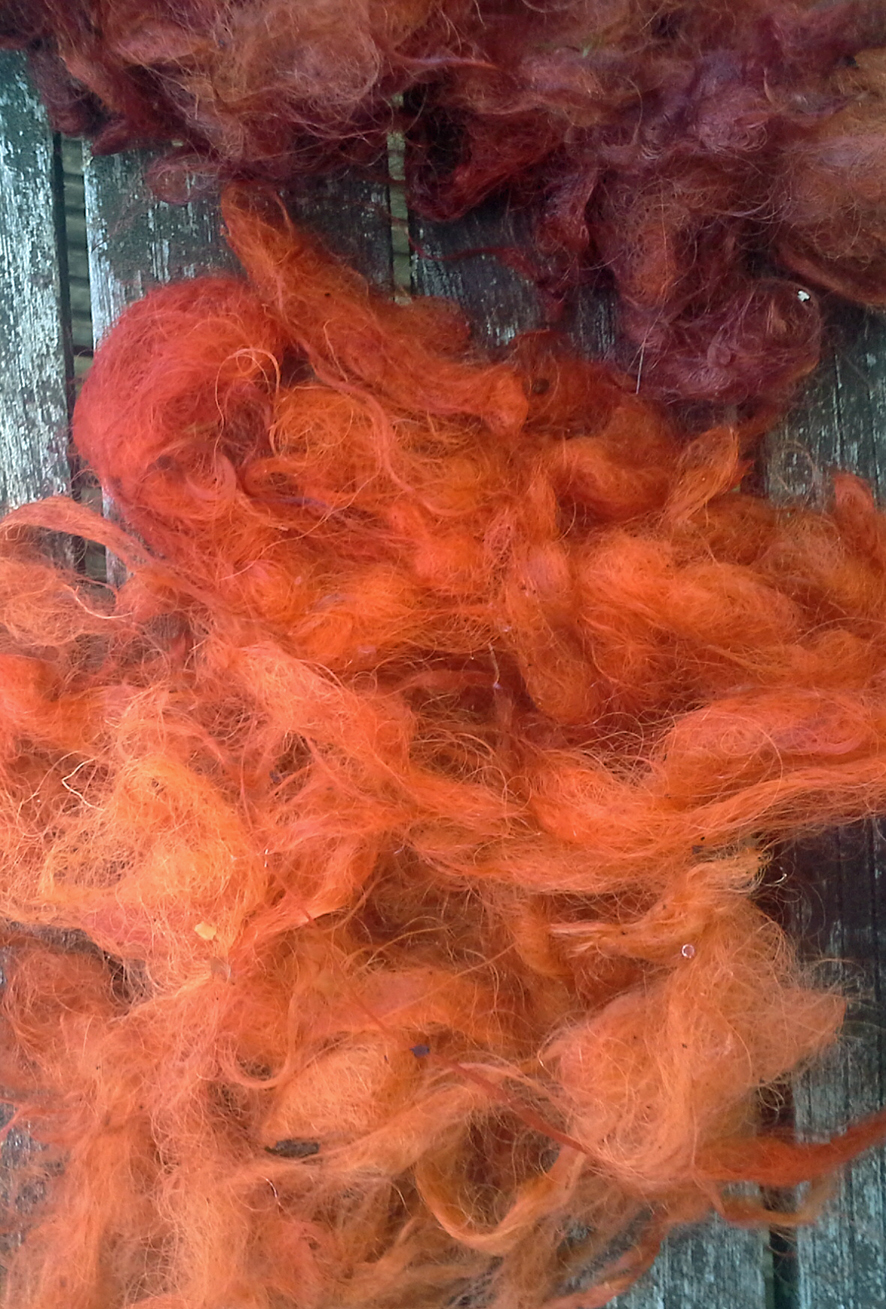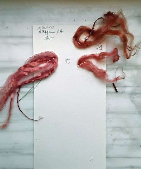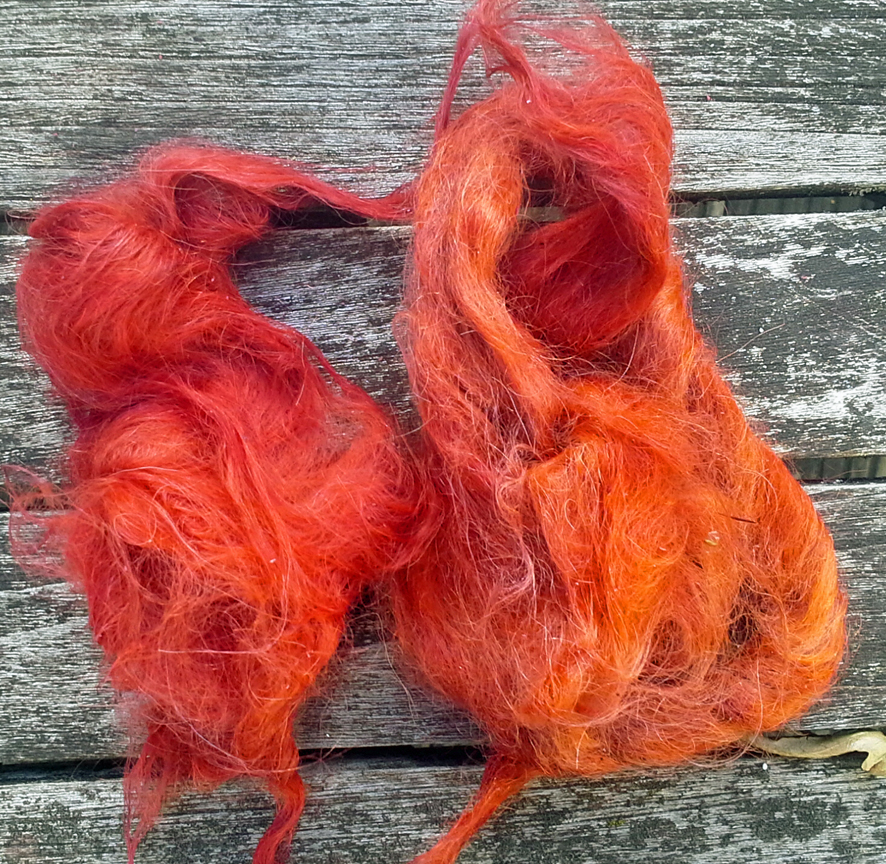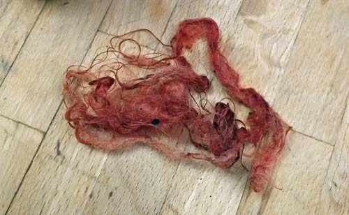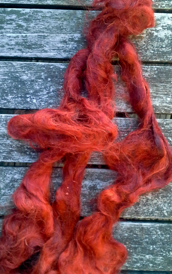 B. Un écheveau chevreau/soie est resté dans le bain de mordant A24-8. Fausse manœuvre (encore une !), un peu de teinture du bain de garance y tombe pendant que j’essore. J’oublie le bain. Le lendemain : l’écheveau est d’un beau coq de roche doux, une merveille. Avec si peu de teinture !