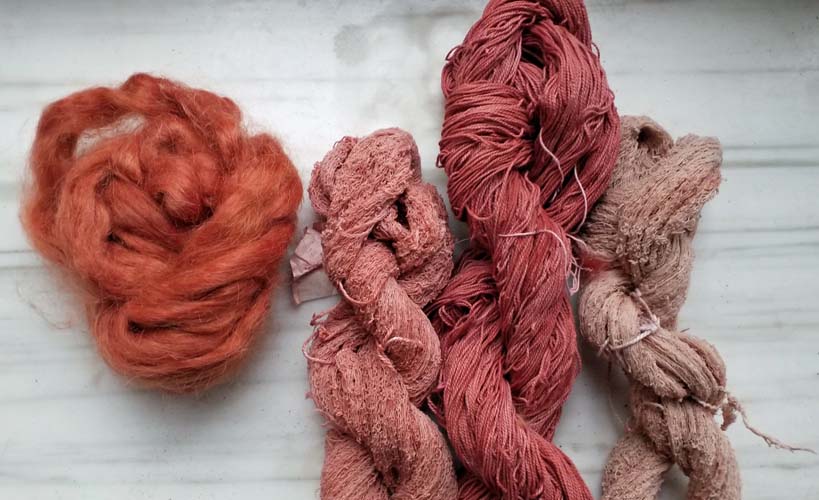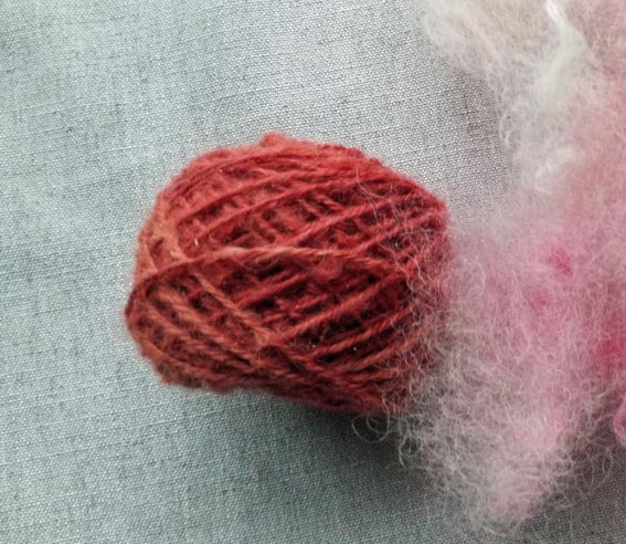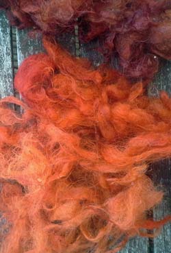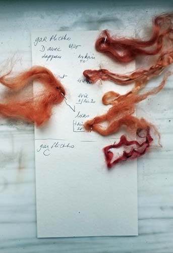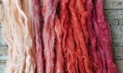 Pour les tons forts, je rend plus rouge par un post-bain dans un reste de cochenille ou de bois du Brésil.