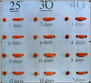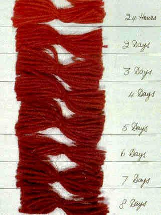 Rubio a testé la tenue du bain à 25 30 et 40°C et les durées de trempage sur plusieurs jours. Résultat toujours orangé, mais nettement bien pris. Pour l' »équivalent du résultat à 40°C, quand elle restait à température ambiante, tripler la durée. 9 jours à 25°C pour avoir la couleur de 3 jours à 40°C. Important de ne pas utiliser de couvercle, mais de rajouter régulièrement de l'eau pour couvrir les fibres. On voit que l'orange donne la place au rouge à partir du jour 7.