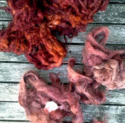 Selon une recette de Jenny Dean. Ici on extrait la couleur et on teint la fibre simultanément. Cela ne convient pas aux tissus, qui en sortiraient bringés.