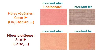 Avec un post-bain de cuivre: rouille foncé; post-bain de fer: brun; post-bain d'indigo: grenat pour tinctorium et brun pour cordifolia.