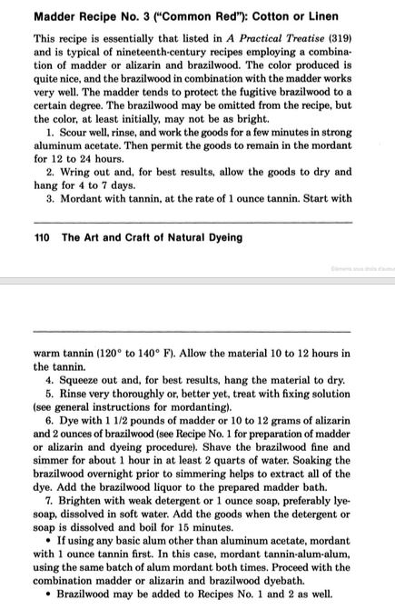 Dès le début, j'ai lu avec attention le livre de Liles, en anglais; je le consulte encore souvent. De très larges extraits sont disponiibles sur googlebooks: 19 pages sur la garance, régalez-vous! Il utilise parfois 50% parfois 100% de garance, surdose souvent avec de l'alizarine de synthèse (il aime la chimie pure...). Souvent, il sature le ton rouge avec 60g de bois de Brésil pour 500g de fibres. Les recettes diffèrent bien sûr selon la fibre.