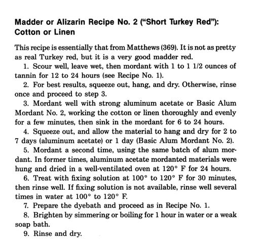 La procédure, qui date du XIXè siècle, a été modernisée. Selon Jim Liles, elle comptait une vingtaine d'étapes réparties sur plusieurs mois. Un long extrait de son livre, pages 110 et suivantes, sur ce type de technique - page 117 la recette précise: https://books.google.be/books?d=&hl=fr&id=VUW-l1Wg1wYC&q=turkey#v=snippet&q=turkey&f=false. Les heureux propriétaires de l'essentiel "Le Monde des teintures naturelles" de Dominique Cardon y liront les pages xx à xx.