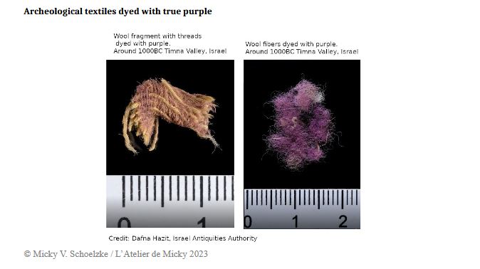 "Il s'agit d'une teinture que l'on retrouve dans l'Antiquité, à l'époque où la véritable pourpre de coquillage était la teinture textile la plus recherchée, souvent réservée à l'élite. Mais ce qui n’est que pour les puissants devient souvent à la mode, et le violet a dû être une couleur de prédilection pour les moins riches également. L'homme n'a pas beaucoup changé depuis quelques milliers d'années... Les teinturiers de l'Antiquité,qui n'étaient pas les derniers à avoir le sens des affaires, ont mis au point une multitude de recettes moins onéreuses pour imiter la pourpre."
