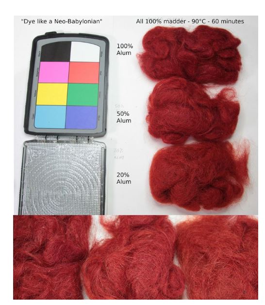 plupart des ouvrages, tutos et divers articles grand public actuels. Néanmoins, la tablette néo-babylonienne mentionnée au début de cet article (traduction cité par Cardon) fait état de la recette suivante : “ Peigne la laine et fais-là bouillir avec de l’alun, à parts égales. Fais bouillir la garance avec la laine, à parts égales avec de l’eau et de l’eau sûre et après une heure, tu auras du rouge”. L’eau « sûre » est de l’eau additionnée de son de blé fermenté, donc acide. La tablette mentionne également, comme dans d’autres sources médiévales, l’existence de différentes qualités de racine de garance. Bien entendu, cette recette simple était très tentante à tester et nous l’avons gardée proche de l’originale à l’exception de l’utilisation d’eau sûre, remplacée par du vinaigre. Le mordançage et la teinture ont été effectués à 90°C pendant une heure. Pour comparer, la même procédure a été utilisée avec 50 % et 20 % d’alun également .Ses tests, dont je retiens que 20% d'alun sont suffisants (à mon avis notre copain babylonien était assis sur de la roche d'alun, pour en utiliser tant!).