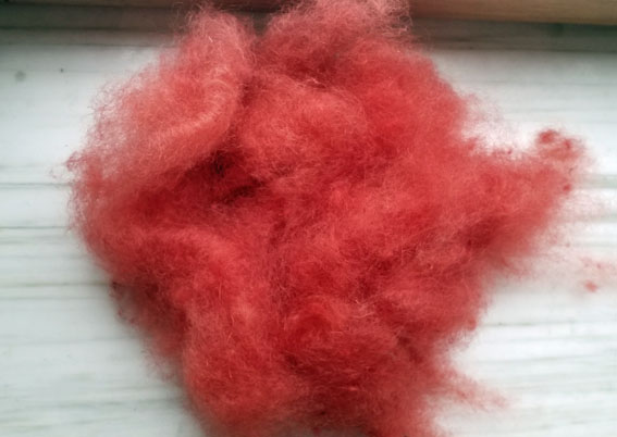 Lors d'un stage chez Valentine Donck en 2015, on avait teint en monobain acide de garance du feutre de laine. Je n'ai pas noté les dosages, mais je n'obtiens pas ce rouge franc ici, j'obtiens plus orangé. Je devrais réessayer avec de la cordifolia.