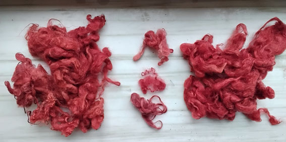 Trois tests , sur de la laine alunée à 12% et 4% de crème de tartre (mon habitude, aurait dû être plutôt 20%) – des mèches pour A et C, du mérinos pour B – avec de la garance tinctorium en poudre (source MichelGarcia.fr).