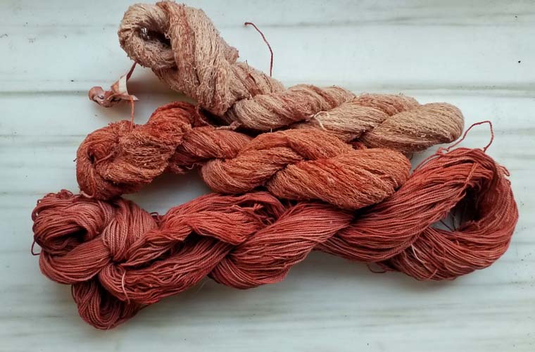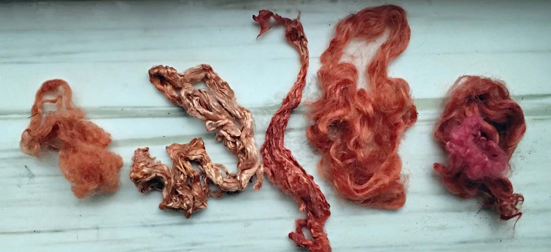 Des écheveaux chevreau/soie, mordancés à 24% alun 8 CT, sont tous déposés en même temps dans le bain, mais prennent des tons un peu différents.