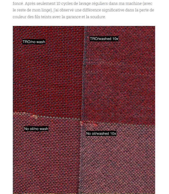 On voit en image 2 un tissé main par Ellis, sur chaine gris foncé: à gauche, non lavé; à droite, lavé 10 fois en machine - en haut rouge d'Andrinople, en bas mordançage classique tanin/alun.