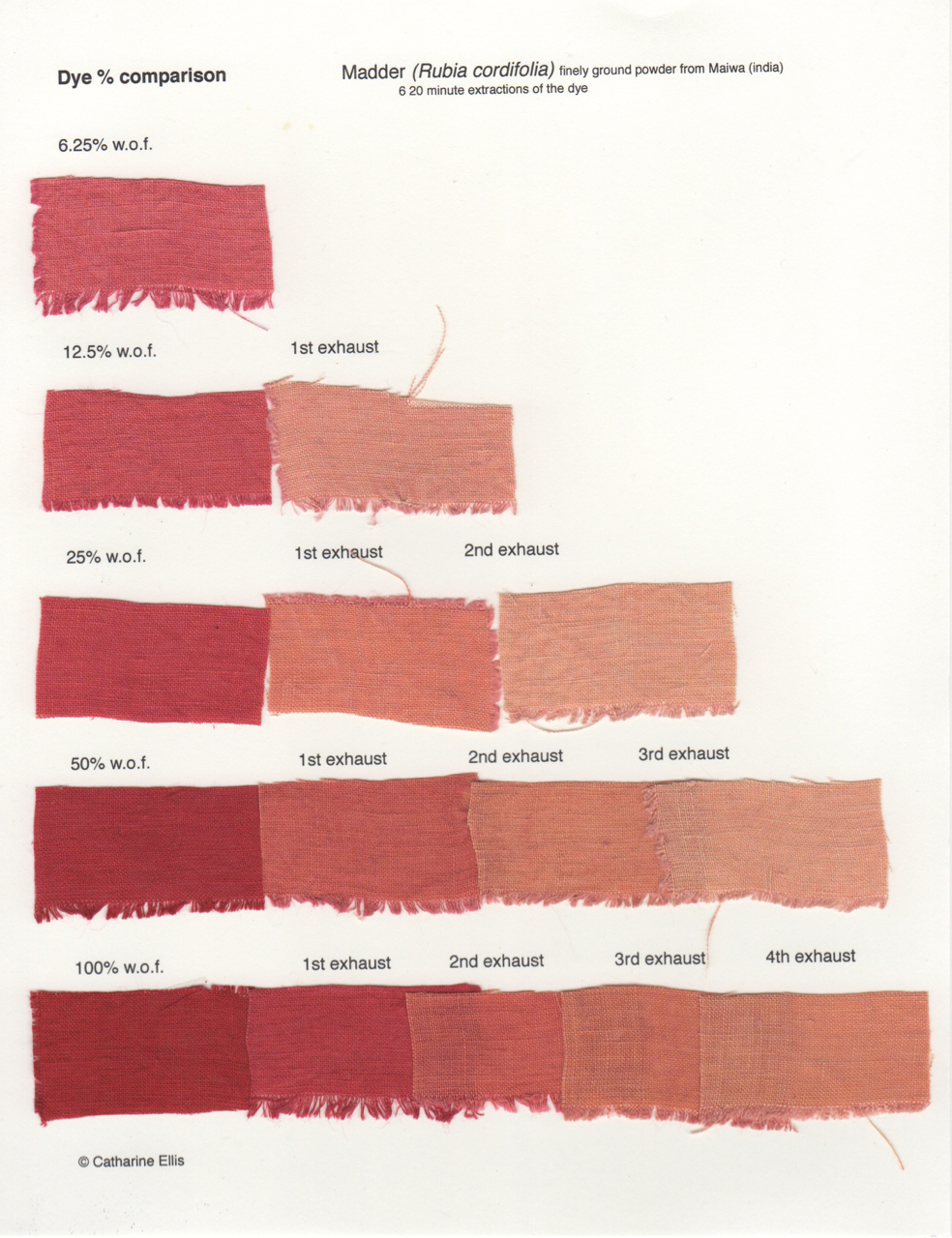 Catharine Ellis extrait à chaud, pendant 20 minutes, plusieurs fois (jusqu'à six). Sans agiter, apparemment, comme on le voit chez Garcia. Elle ne teint qu'avec l'extraction, et ne laisse pas la plante dans le bain de teinture. Voir par exemple ses tests dans Digging Deeper into a Single Dye – Madder (Rubia cordifolia) - 2016, qui donnent envie de suivre sa procédure. On dirait que le vieux conseil de "toujours" garder la garance dans le bain est obsolète et que sa technique d'extraction multiple est parfaite pour capter le rouge.