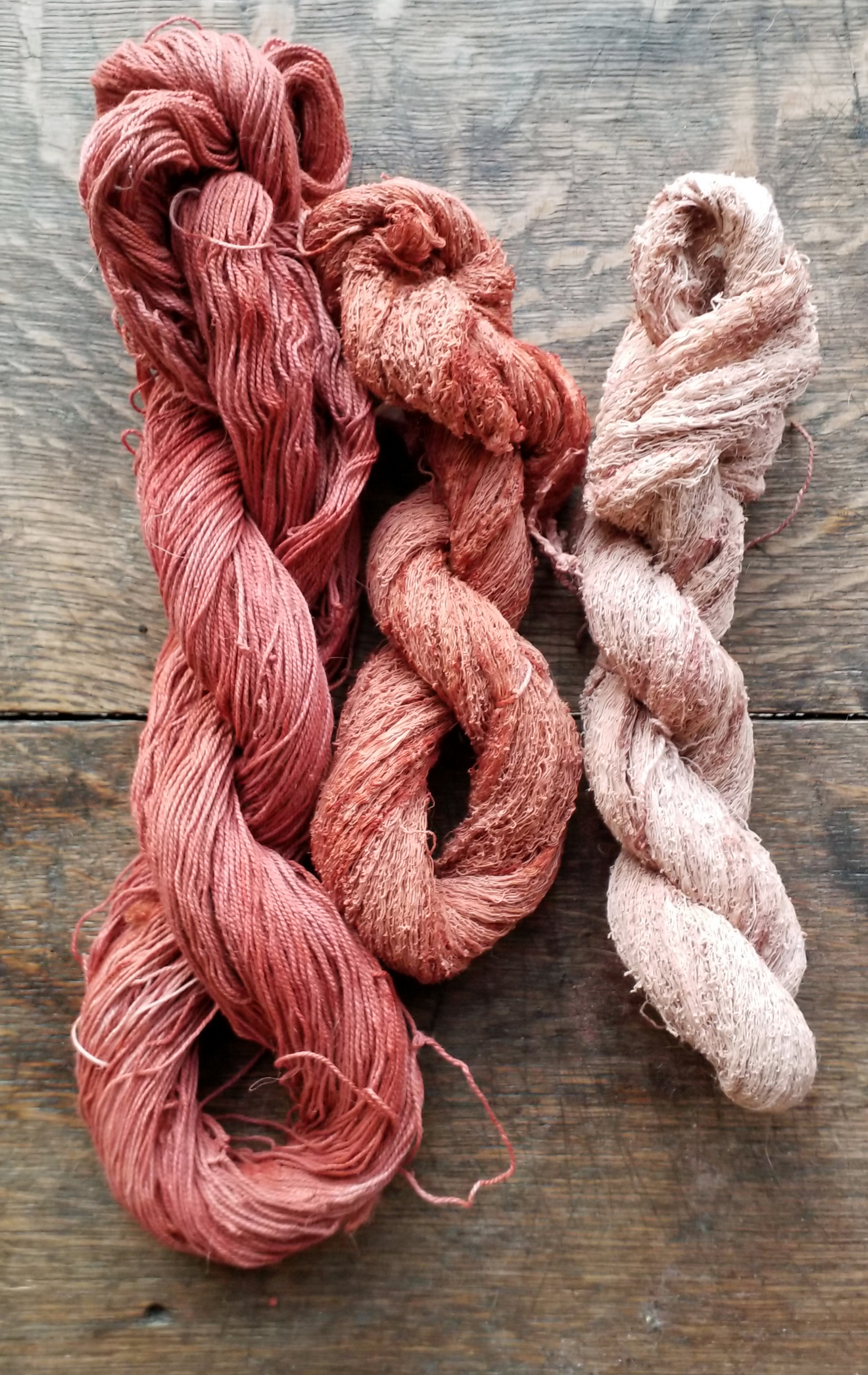 J'appelle DS' le bain restant du plictho D d'avant-hier (au sappanwood), que je réchauffe au bouillon fort et dans lequel je dépose un écheveau léger de soie/coton FB (Francis et Bart) et l'écheveau de coton 8/2 de Venne qui a déjà été teint avant-hier dans D, que j'ai rincé, laissé sécher pour l'oxyder - ceci, dans la croyance (?!) que ça densifie les tons.