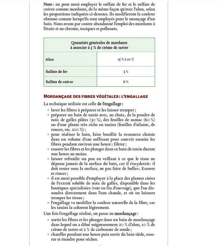 Voir un extrait éditeur du formidable livre de Marie Marquet, petit et dense, indispensable aide-mémoire: "Guide des teintures naturelles" - la différence: l'auteur fait suivre les tanins d'un alunage coton classique, bien moins efficace que l'AA: