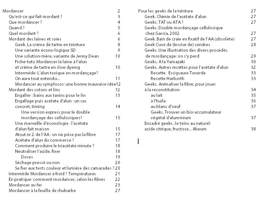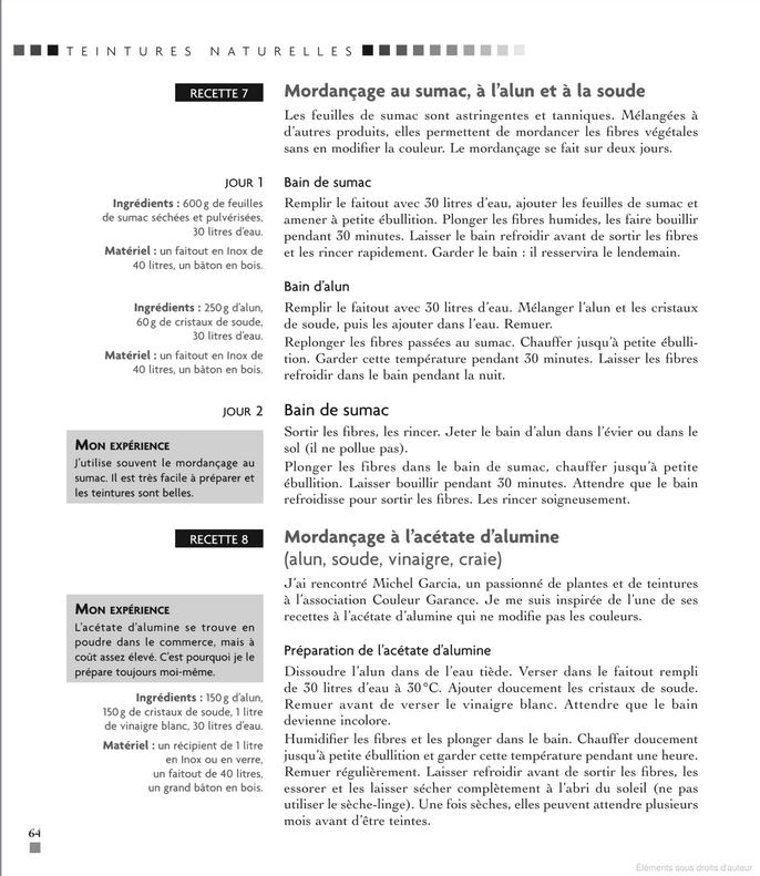 Geeks. Double mordançage cellulosique chez Garcia, 2002 - Geek. Bain de craie en fixatif de l’acétate d'alun (obsolète) - Geek Cuve de (lessive de) cendres id - Geeks. Une illustration des divers procédés de mordançage: on s'y perd - Geeks. A la Yamazaki - Geeks. Autres recettes pour l’acétate d'alun - Recette Essigsaure Tonerde - Recette Harborth - Geeks. Animaliser la fibre, pour jouer à la reconstitution - au lait - à l'huile - au blanc d'oeuf - Geeks. Trouver un bio-accumulateur végétal d’aluminium - Encadré geeks. Je teins au naturel: acide citrique, fructose...