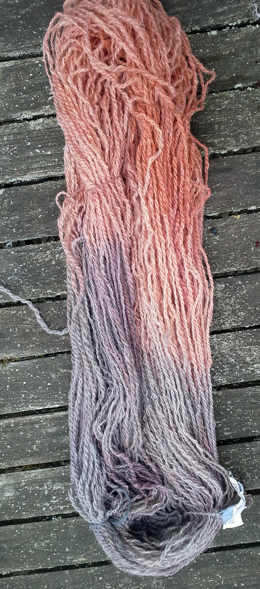 La difficulté en tissage: si on peint en spacedyed un écheveau sans construire un design précis, on finit en boue de couleurs. Ce qui n'est pas le cas en tricot. C'est pourquoi on privilégie les chaines peintes. Mais... on peut teindre un écheveau et non une chaîne déjà ourdie. On pourra être moins précautionneux dans le lavage, puisque la chaine n'est pas encore ourdie.