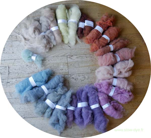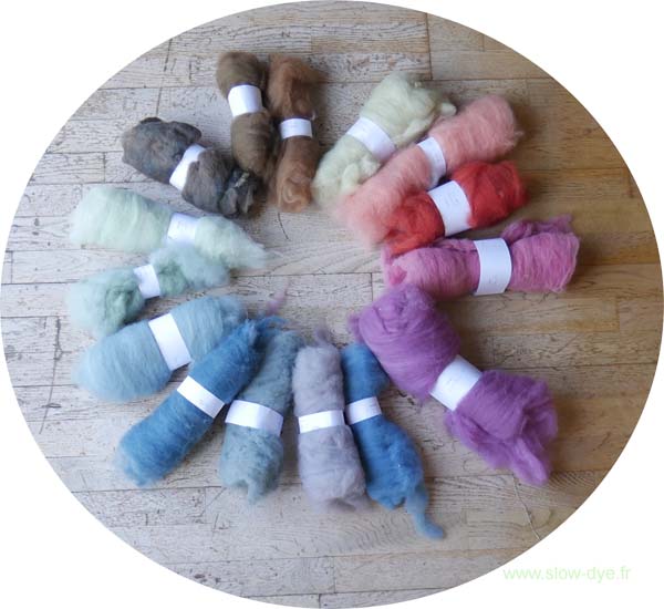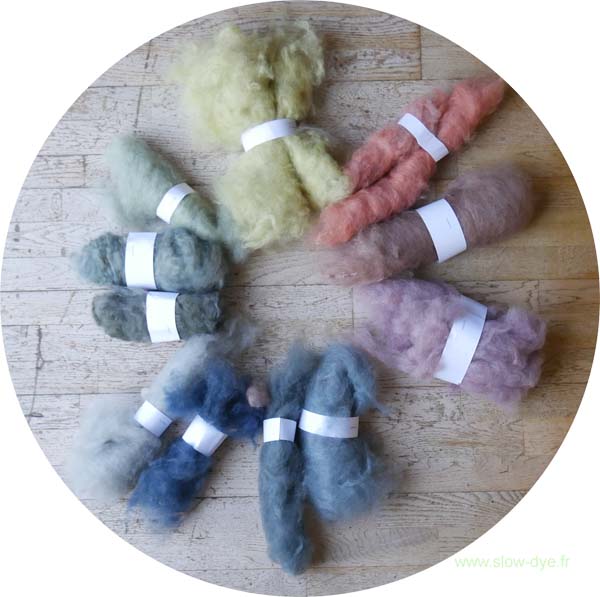 Et dire que je n'ai pas fini de carder mon stock déjà teint. J'ai de quoi filer tout l'hiver. Et plus, si affinités. Je ne me lasse pas de ces belles couleurs!
