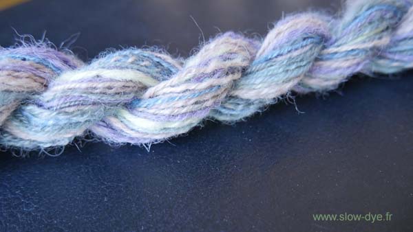 Pour les laines et soies filées main, je privilégie le filage séquentiel, que j'aime appeler filage en arc-en-ciel : j'alterne tous les 2 mètres de fil environ un autre ruban, je retords en navajo (3fils, ce qui me fera une longueur par couleur d'environ 70cm). J'obtiens ainsi un fil multicolore qui vibre beaucoup plus que ceux qu'on obtient avec les techniques précédentes. C'est laborieux, c'est long, mais c'est joyeux!