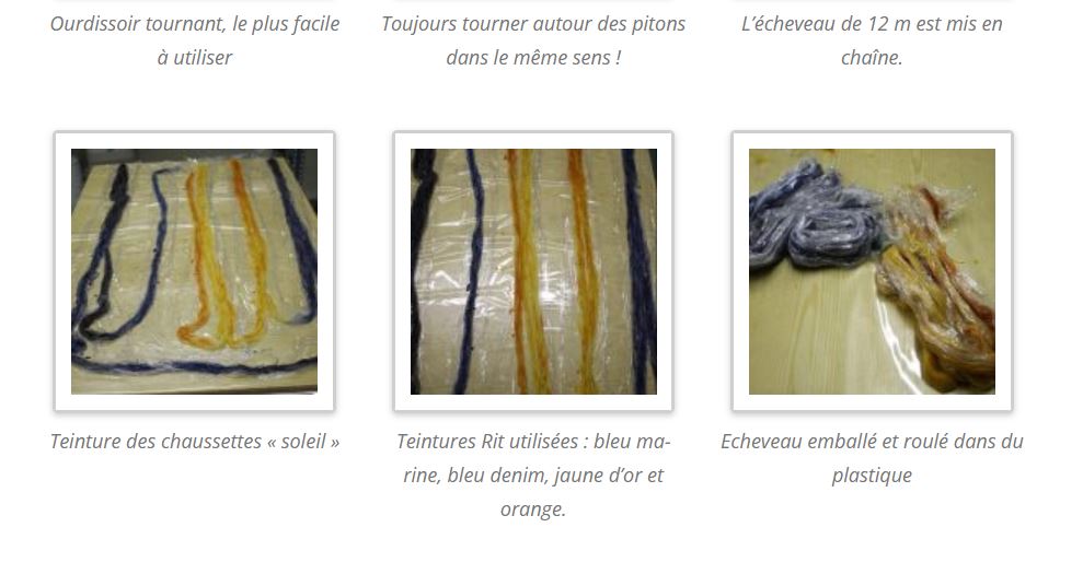 Je relis les conseils de Synn Mitchell dans son article imagé "Painted-Skein Warps" où elle expose comment préparer des écheveaux en palindrome. (NB 2025. Site fermé, hélas! J'ai gardé les articles, je peux les publier si on me le demande).