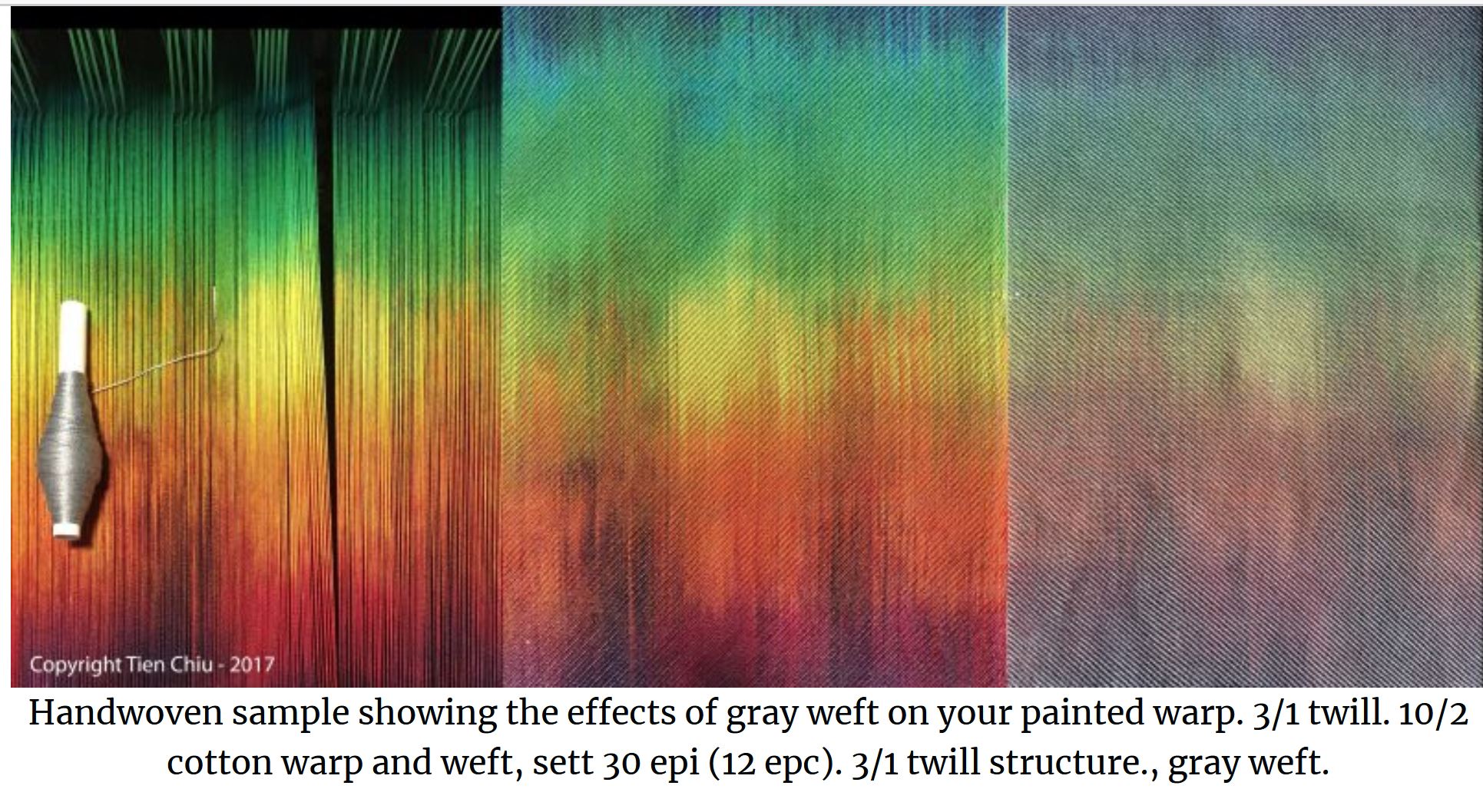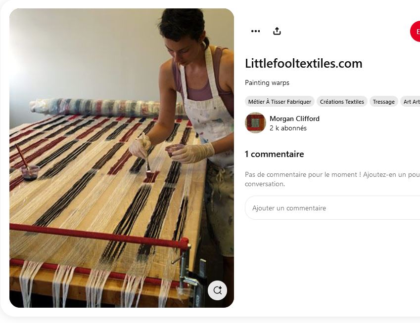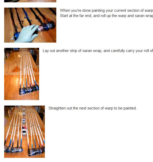 En tant que tisserand, on aime peindre la chaîne hors du métier (rarement sur le métier): il faut d'abord ourdir la chaine, puis l'étaler pour la peindre sélectivement, soit par des aplats de couleurs (ci-dessous), soit des graphismes stricts (partie suivante). Ensuite, on la monte sur le métier et on tisse.