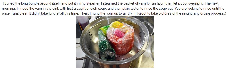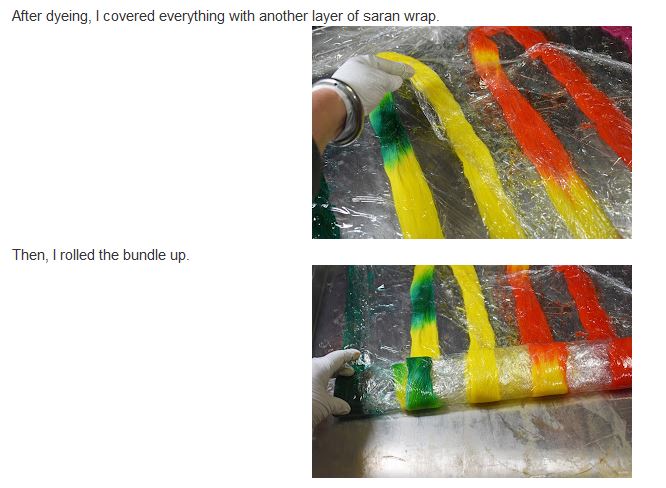 La partie la plus délicate mais aussi la plus exaltante vient ensuite. Le but est de poser son écheveau sur la table de façon à bien démarquer chaque portion que l’on souhaitera teindre dans une couleur donnée. Ce qui n’est pas aisé avec une si grande longueur. Surtout qu’il faudra ensuite emballer chaque zone de couleur séparément des autres pour qu’elles ne migrent pas. Je montre une façon de faire, mais il en existe d’autres, à vous de voir ce que vous préférez. Ensuite, le mode opératoire est le même que pour la méthode n°1 : on laisse aller son imagination, puis fixage de la couleur au micro-onde, 2 mn à pleine puissant, pause de 2 mn, on répète encore 2 fois. Attendre au moins 30 mn avant de déballer et rincer.