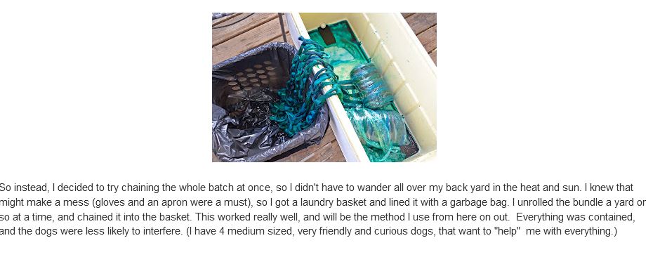 La plupart des tisserands se plaignent de chiffonner leur longue chaîne lors de cette opération (tout comme c'est possible en peinture de chaine classique) - opération qui prend alors bien plus de temps que prévu puisqu'il faut réourdir tout le bazar chiffonné. Bonnie Tarse a inventé une solution de "presqu"ikat" qui règle ce problème. Voir dans le billet ad hoc.