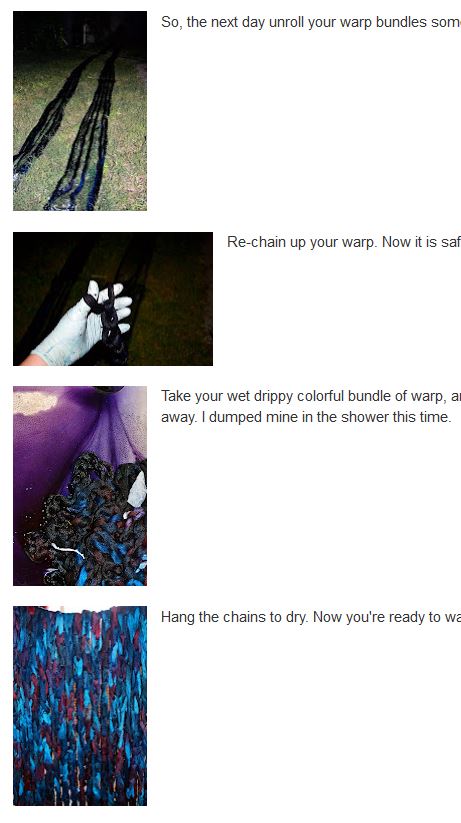 Ici: crocheter la chaîne ourdie et la laver sans trop la remuer (si laine) . Source des photos: https://tangibledaydreams.blogspot.com/2012/09/tutorial-warp-painting.html