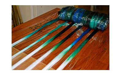 Les couleurs sont appliquées, il faut ensuite rouler le cellophane soigneusement, le fixer à la vapeur ou au micro-ondes, puis le rincer .