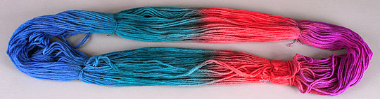 Idéalement, en tissage, on travaillerait avec de très longues chaines les multicouleurs. Sinon, les tons complémentaires seraient trop proches dans le tissu final; on ferait "de la boue". Refrain habituel. En teignant la chaîne entière, on voit clairement la répartition des tons.