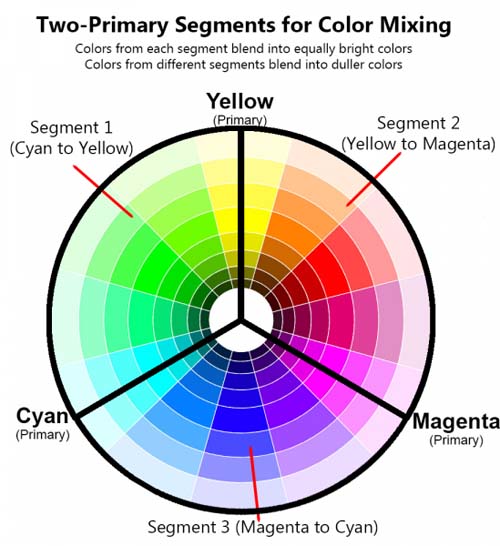 Pour les novices coloristes, un peu d'aide chez Tien Chu, très didactique et partageuse (2024: qui donne désormais des cours chez handweaving Academy). On se base sur le cercle chromatique, dont j'aime la version simplifiée chez Chiu: on y voit clairement, par surface, les couleurs primaires et leurs secondaires respectives.