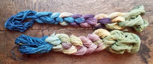 La première solution pour teindre en séquentiel (écheveau ou chaîne) est la plus évidente: on trempe un écheveau mordancé à l'alun en partie dans une casserole de colorant 1, pendant que l'autre baigne dans un bouillon de produit 2 - garance et gaude, par exemple; les zones communes seront orange. On peut ensuite tremper des bouts de cet écheveau dans une cuve d'indigo pour des grenats et des verts, aux extrémités.