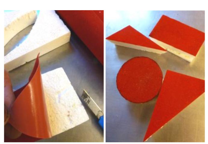 Michel Garcia propose aussi de récupérer de la frigolite, qu'il découpe facilement au cutter aux formes voulues. Pour un meilleur rendu, il colle du tissu de velours dessus (s'achète en velours à coller, pour meubles). Voir ci-dessous une photo extraite d'un pdf de son intervention au symposium 8ISS.