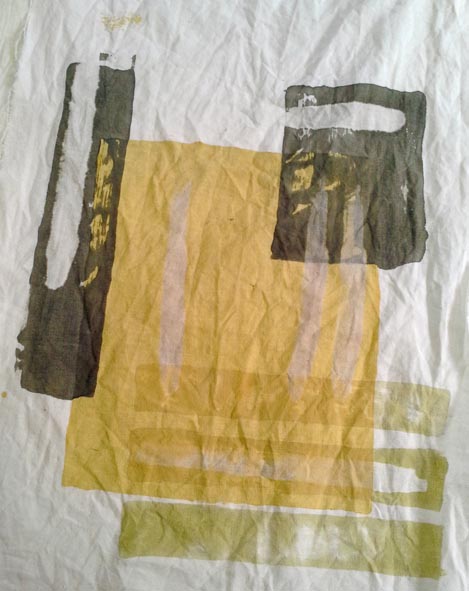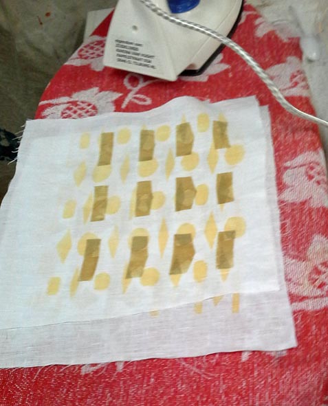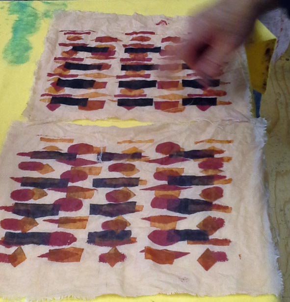 avant teinture - exemple d'une collègue de stage (2014,chez Zijdelings.eu), avec son autorisation (idem pour toutes les photos qui suivent). Le tissu a reçu des mordants différents selon les pochoirs ou tampons :