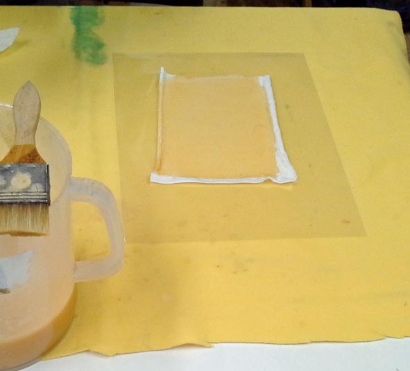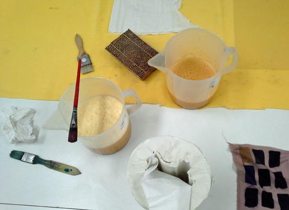 On a fait deux solutions: 20g d'acide citrique dans 100ml d'eau + 1g de gomme de guar (pour du blanc de blanc), 5g d'acide citrique dans 100ml d'eau; + 1g de gomme de guar (pour du clair). Epaissi avec de la gomme. Ajouté une pincette de bois de brésil dans le gel, pour pouvoir le repérer (le bois du brésil est plus "faible" que cochenille ou garance, donc cèdera la place); mais je crains que ça ne tâche la solution de fixation au silicate de soude qu'on utilise en commun.