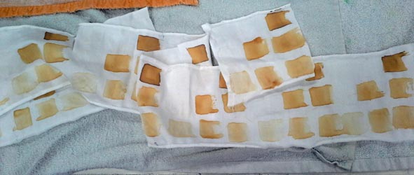 Si vous travaillez sur des tissus déjà mordancés à l'alun, vous ne pourrez jouer que des mordants de fer et de titane. C'est évident, mais il vaut mieux le répéter.