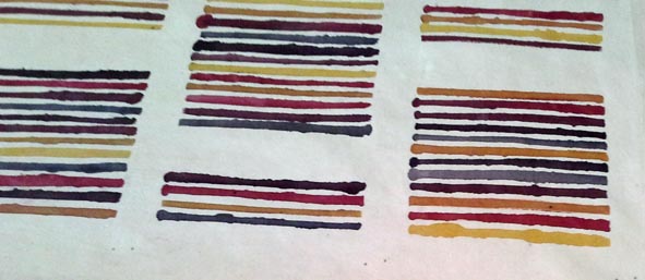 Les jeux de couleur ne dépendent pas seulement du colorant brut, mais aussi des mordants, comme Michel Garcia nous l'a montré avec le génial dictionnaire du voyageur. On sait que la cochenille donnera des roses et des violets, ou que la gaude produira un jaune lumineux... ou du vert tendre... ou du jaune plus éteint, car les couleurs se révèlent différemment selon le mordant que l'on a utilisé pour la fibre. Dans son dictionnaire des voyageurs, Michel Garcia propose, pPlutôt que de continuer à l'aveuglette, de procéder une fois pour toutes à un test des produits que l'on a récoltés, dans l'eau que l'on utilise, avec les mordants communs comme l'alun ou le fer.