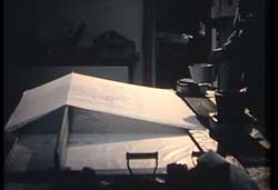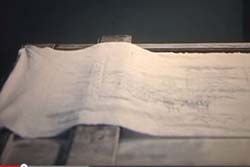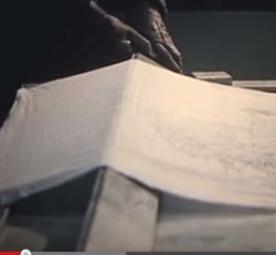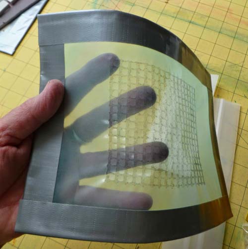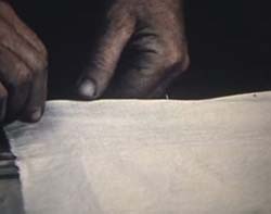 (photos 3 et 4) le tissu est tendu par une planche tenue sur la tranche.