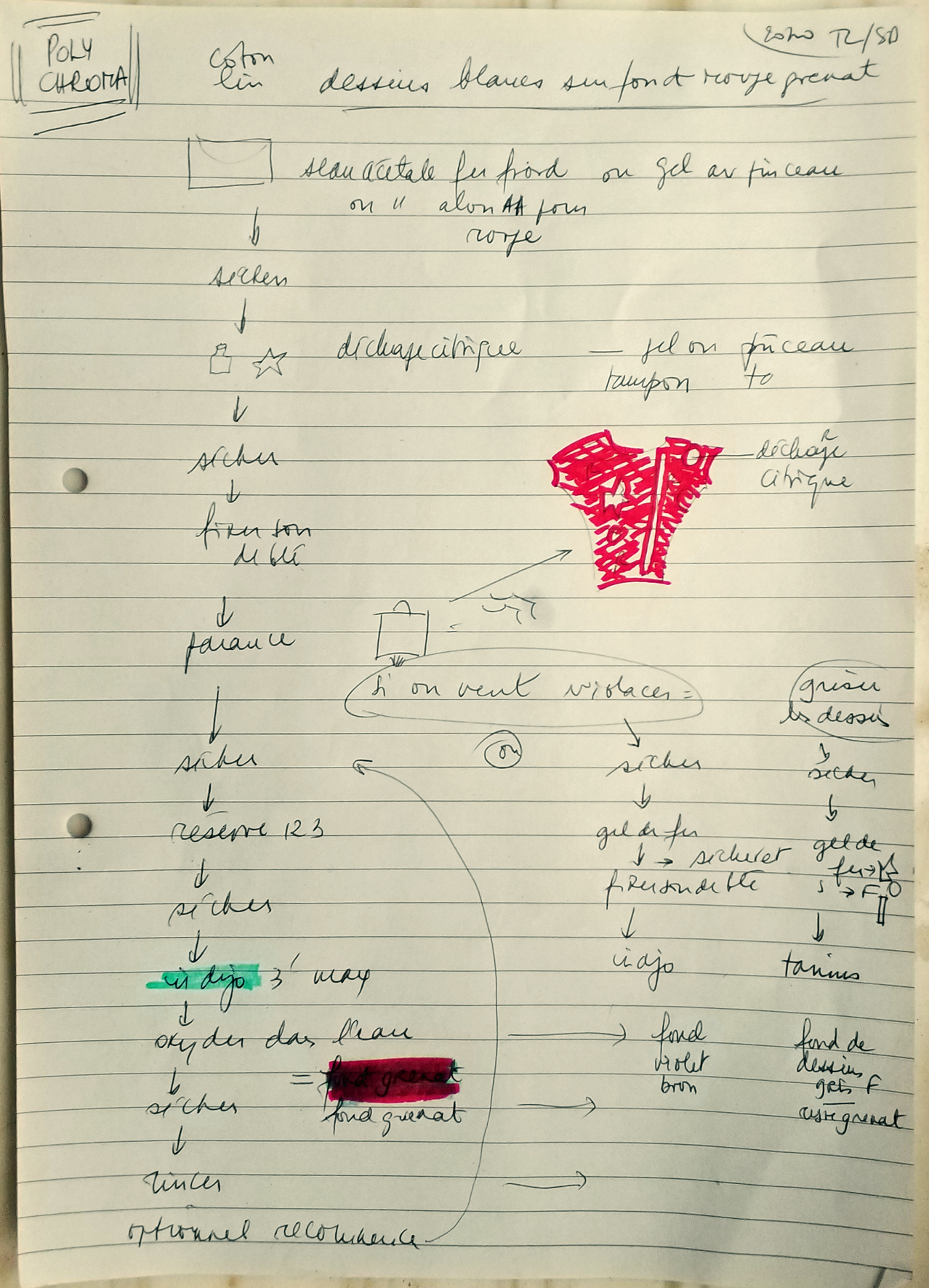 En concret: je tamponne la fibre par zones, les unes au gel de fer, les autres au titane, les dernières à l'alun et enfin d'autres encore au fer mélangé à l'alun. Je sèche, je fixe par vapeur ou par bain de craie, puis je teins: soit en un seul bain, soit en étalant le tissu entre deux bains de chauffe (gaude d'un côté, garance de l'autre).