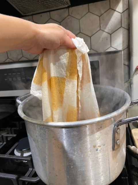 Si les photos figées d'Amy ne vous conviennent pas, je propose une démo en images qui bougent, très basique, mais très détaillée: Kristin Arzt applique un mordant d'alun en divers graphismes, avant de teindre au bouillon classique - Mordant Printing with Natural Dyes: Supplies, Materials, Steps, + Application