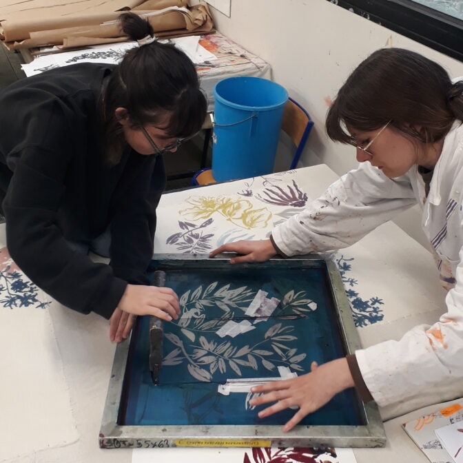 Voir des travaux d'élèves d'école d'art, lors d'un atelier avec Clément Bottier chez Esaat Roubaix: ils sérigraphient des modèles aux gels colorants