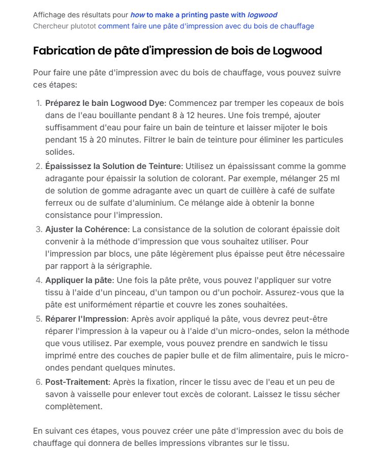 C'est pas mal pour une période d'enfance de l'IA. Je corrige d'abord le contexte: il s'agit ici d'impression sur laine et soie, car le coton demanderait de l'acétate; or pas de vinaigre dans cette page. Puis je rajoute point par point des précisions: