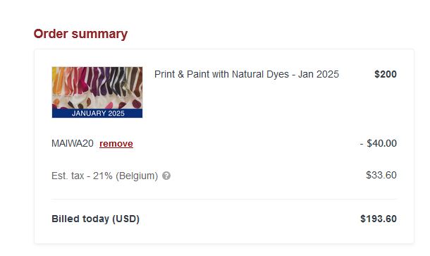Un séminaire en ligne de 9 semaine, 25 projets pratiques et 40 vidéos, quantité de documents en pdf et questions écrites aux instructeurs. Début 2025: promo de 20% avec le code « maiwa20 » : 160$ US au lieu de 200$, mais ajouter 21%de tva (BE). Voir image: j'ai simulé un achat depuis BE: